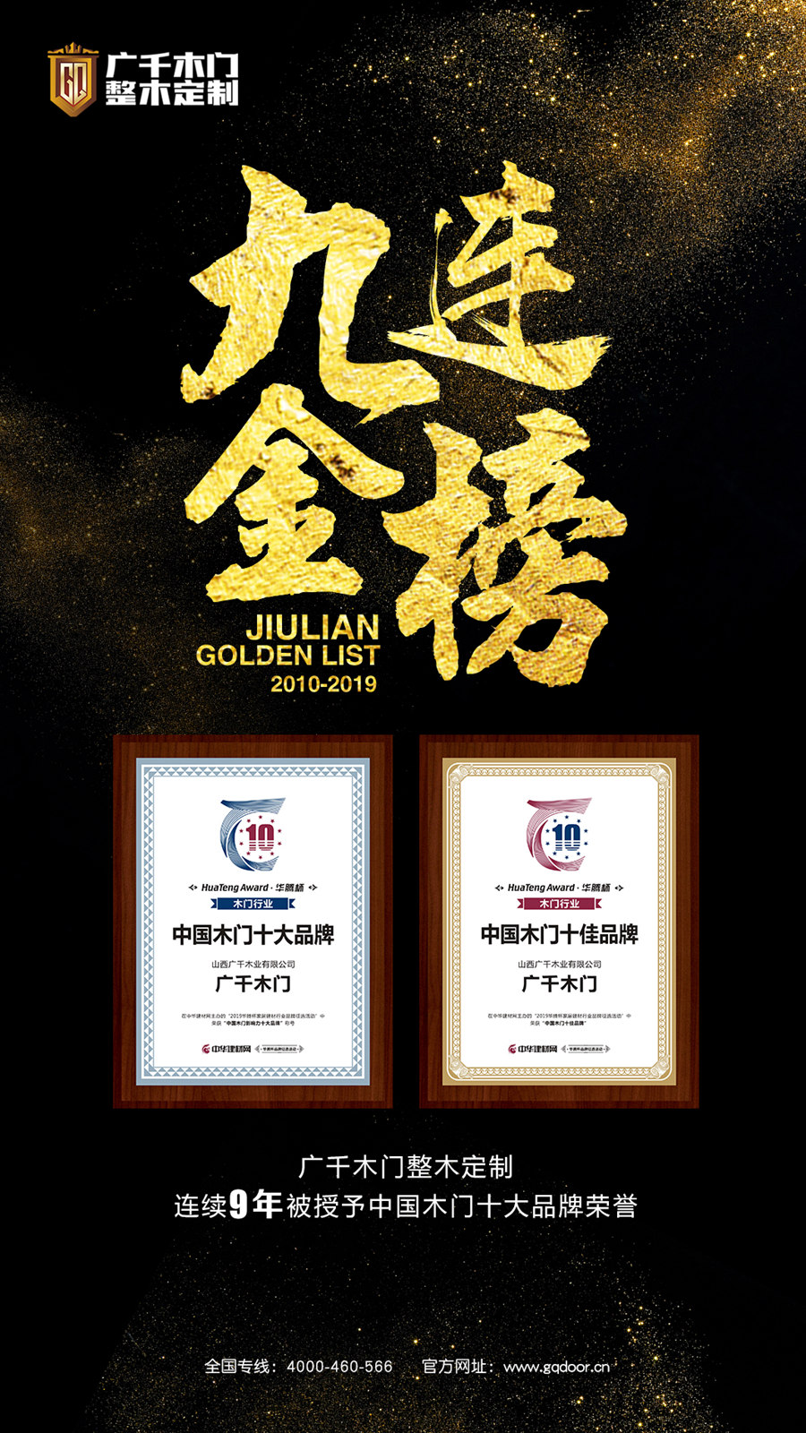 廣千木門整木定制憑借多年的業(yè)內(nèi)口碑積累、誠信的經(jīng)營之道、過硬的產(chǎn)品質(zhì)量和覆蓋華北乃至全國的經(jīng)銷網(wǎng)絡(luò),再次斬獲兩項(xiàng)最高榮譽(yù)—“中國木門十佳品牌”“#p#分頁標(biāo)題#e#中國木門十大品牌”!
