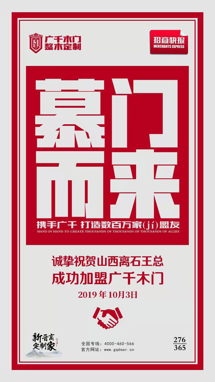 喜報(bào)!廣千木門(mén)新喜報(bào)!山西呂梁市離石區(qū)王總成功加盟廣千木門(mén),成為廣千木門(mén)大家庭中的一員,以后將與廣千木門(mén)攜手展望未來(lái),共同發(fā)展。