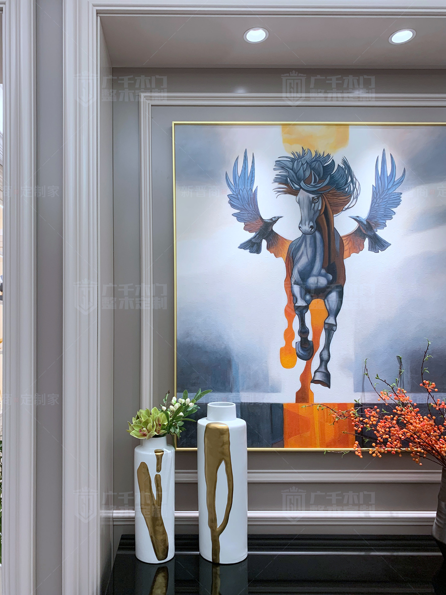 主色選用廣千愛爾蘭白,妙用金屬飾條闡述時代文化,讓人仿佛穿行在藝術故事的長廊,探尋傳承木作之美。羅馬柱與壁爐無疑是歐式風格最具歷史流韻的風物標志。