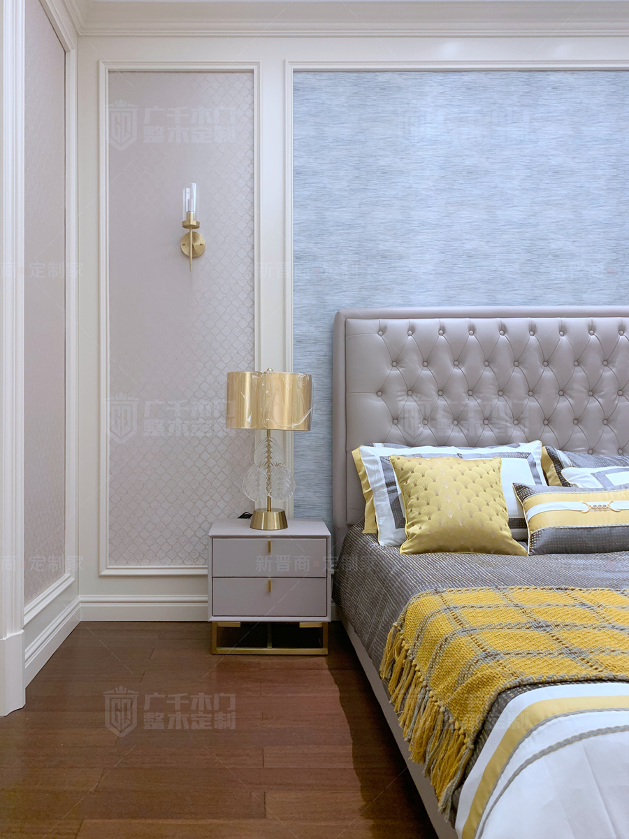 真皮床頭搭配混油背景墻,整體氛圍淡雅而不失厚重,在追求精致內涵的同時也注重空間居住的舒適度和實用性,讓人卸下一身疲憊,讓家可以詮釋自我。