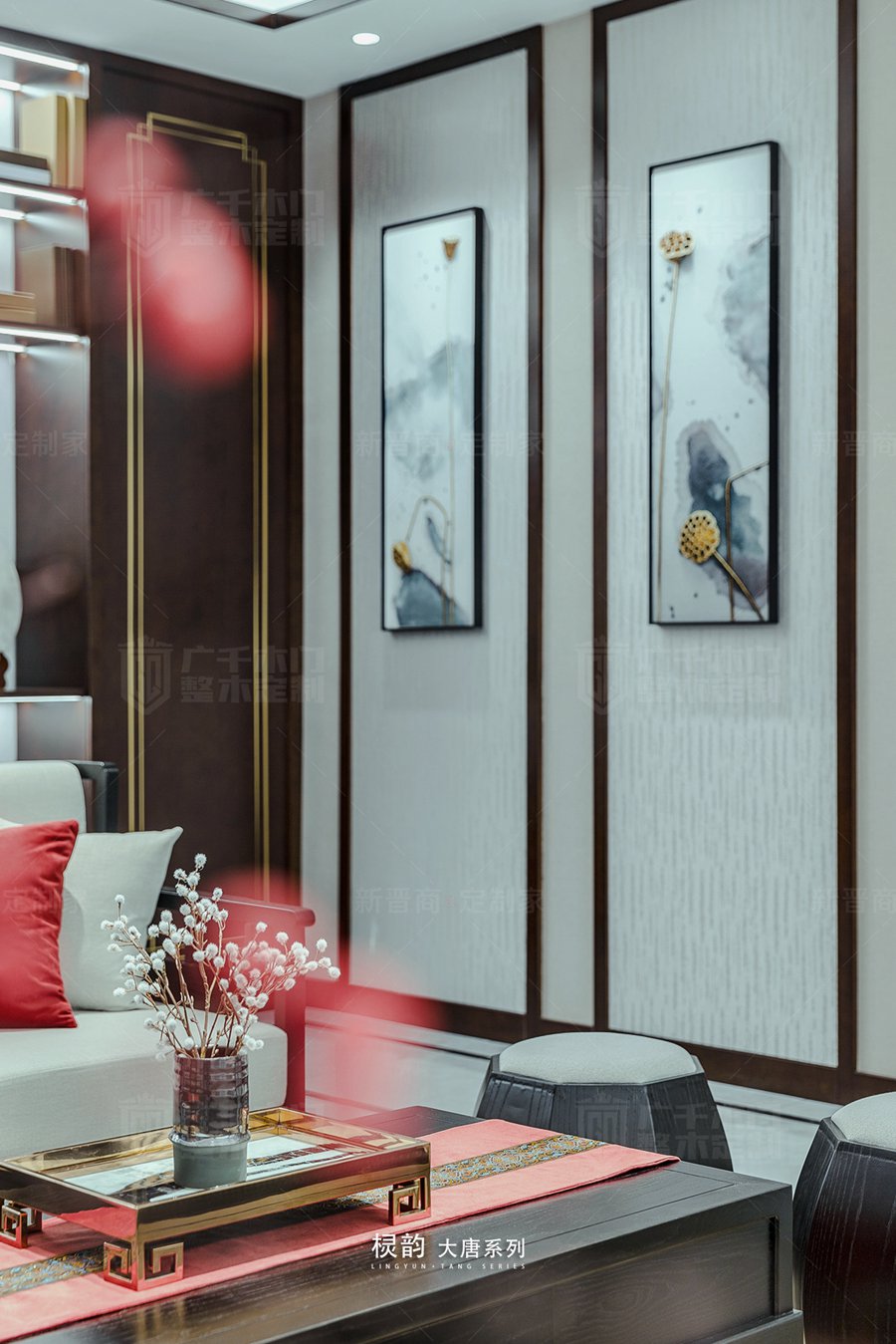新中式造景上將傳統(tǒng)的古香古色與現(xiàn)代素雅自然巧妙地結(jié)合。“厚而不重、山水字畫”,淺色水墨畫清新舒雅,深色收納柜雍容不迫,有格調(diào)又不顯壓抑。