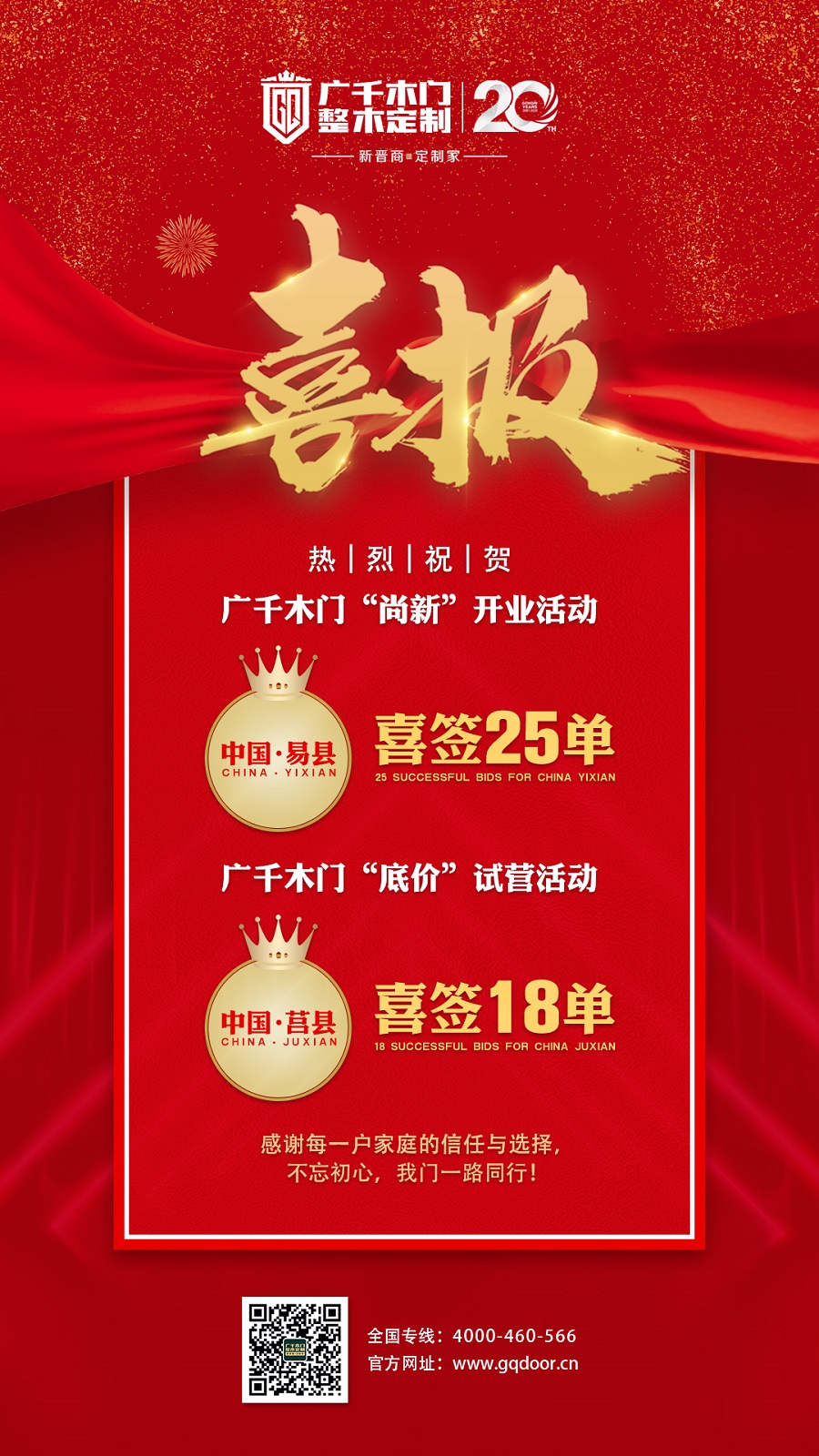 廣千·易縣體驗(yàn)館在“尚新”活動期間,簽單不斷,短短21天,門店喜簽25單;廣千·莒縣輕體館在“底價(jià)999”活動期間銷售成績同樣驚艷,短短18天,喜簽18單。此次活動優(yōu)惠力度空前,吸引眾多顧客紛紛下定,后續(xù)訂單還在持續(xù)溝通量尺當(dāng)中。兩店均收獲滿意的成績單,離不開廣千總部的大力支持,我們也期待兩店捷報(bào)頻傳。