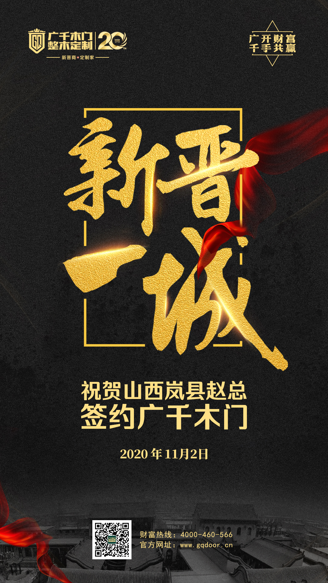 中國(guó)木門(mén)十大品牌十一月開(kāi)門(mén)紅!2020年11月2日,山西嵐縣趙總正式加盟整木定制十大品牌廣千木門(mén)整木定制,恭喜趙總成功拿下山西嵐縣品牌經(jīng)營(yíng)權(quán)。