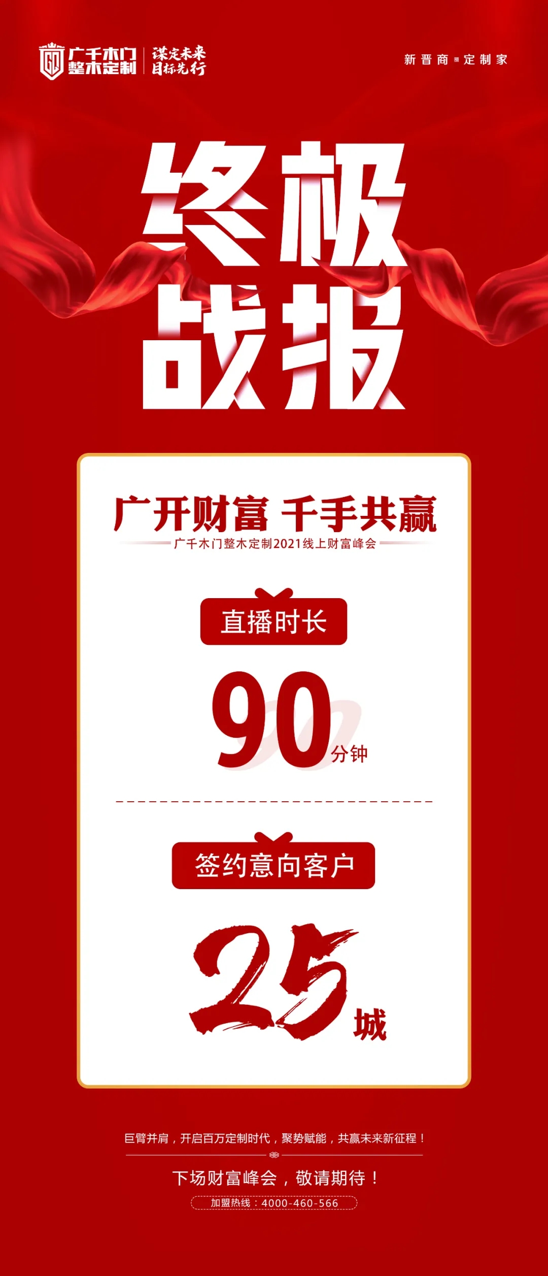 伴隨著簽單的喜悅,廣千木門2021年線上財(cái)富峰會(huì)圓滿收官!感謝社會(huì)各界對(duì)廣千的支持和幫助,同時(shí)也歡迎25位新商的加入,讓我們攜手共進(jìn),共創(chuàng)整木定制事業(yè)奇跡~