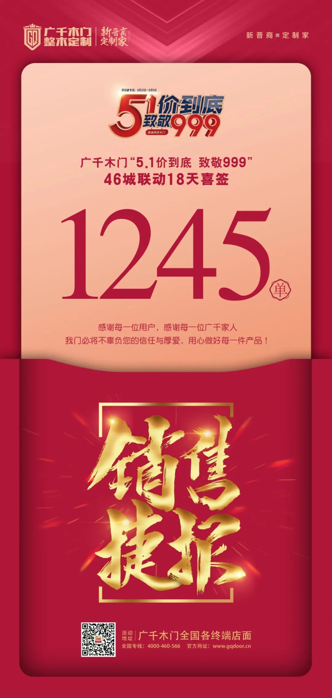 5月9日,為期18天的中國木門十大品牌廣千木門“ 致敬五一 ”全國聯動圓滿告捷,各軍團持續(xù)發(fā)力,捷報頻傳,銷售額一再刷新紀錄!18天創(chuàng)造了喜簽1245單的驕人成績。46個終端城市的廣千門店都為這場聯動交上了一份滿意的答卷。