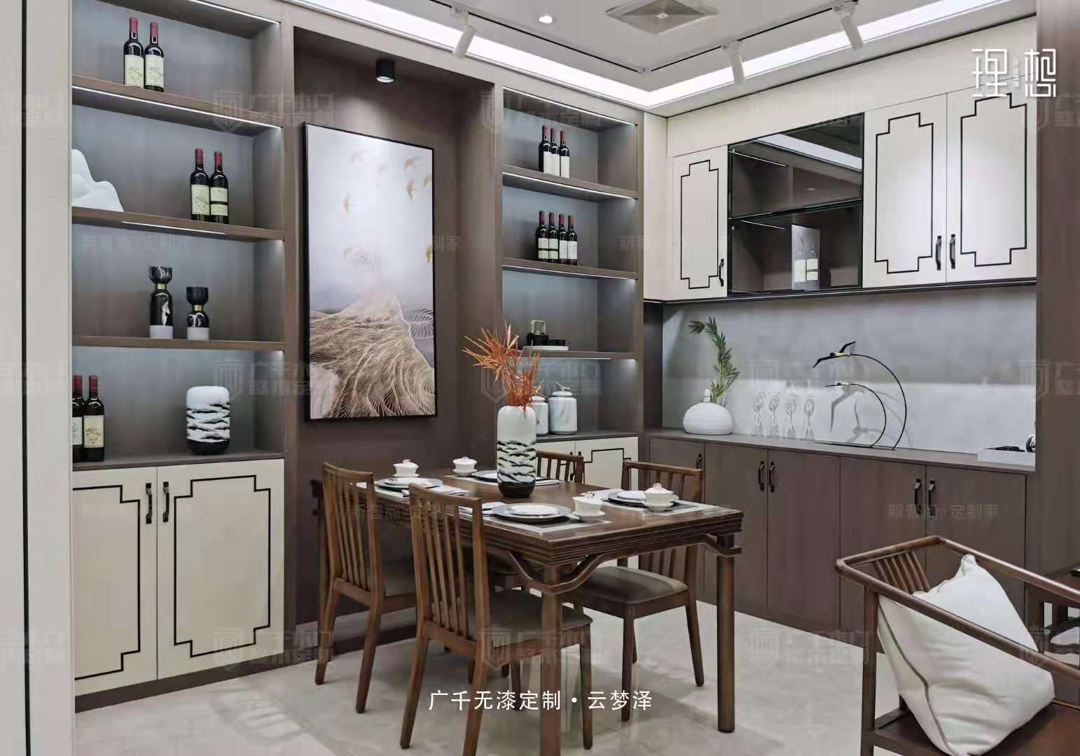 整體空間清晰素雅,開闊通透,浸透著東方特有的禪思靜謐。胡桃木色墻板與簡約新中式家具巧妙搭配,增添幾分藝術的從容,中式大宅的氛圍立現(xiàn)。