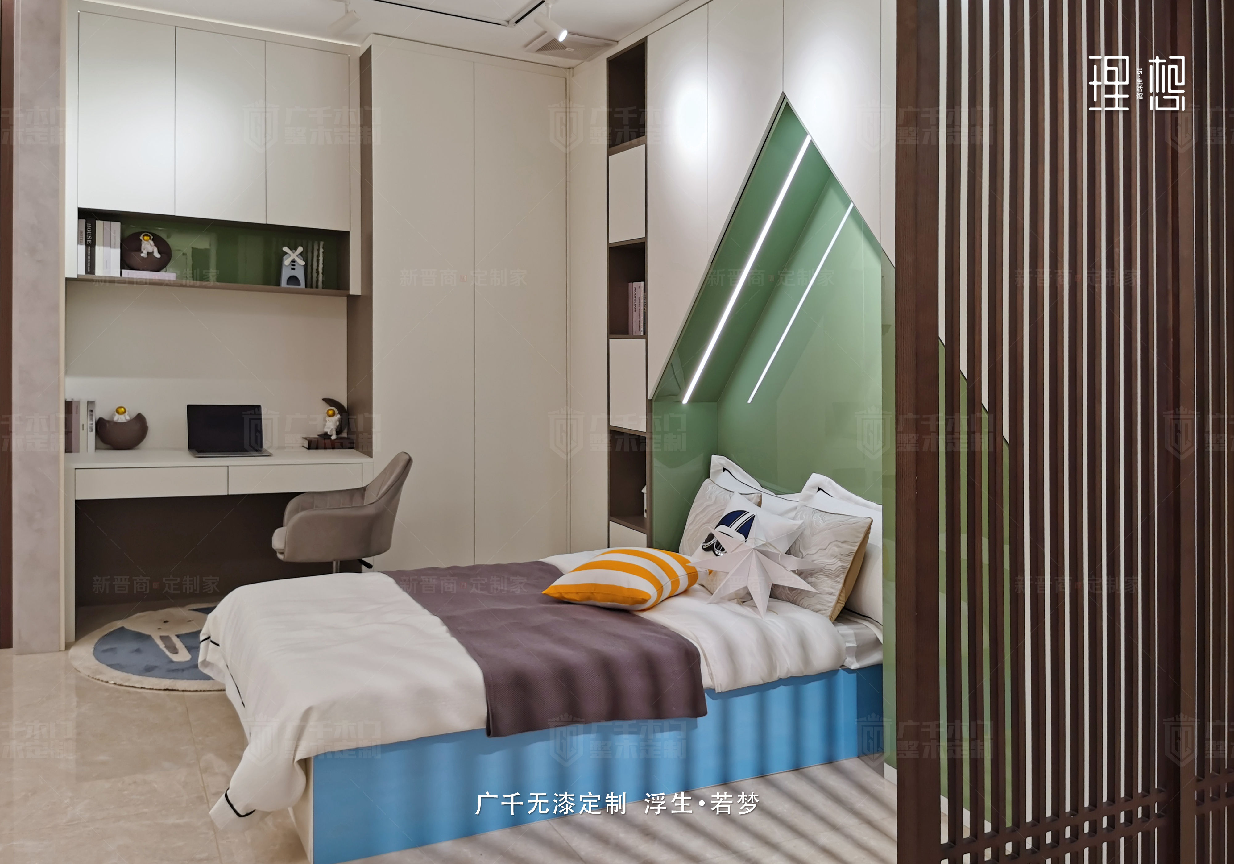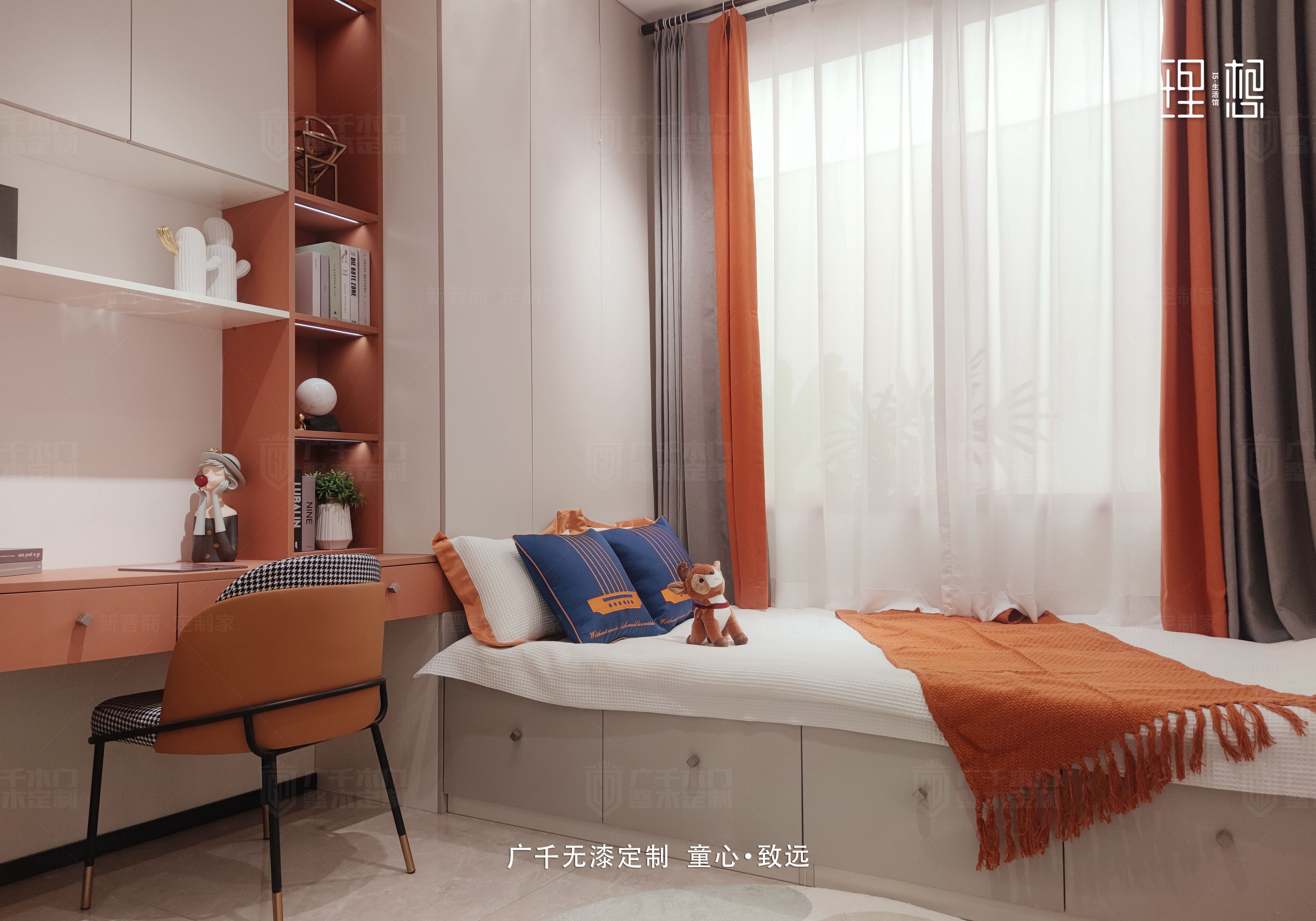 生活簡單一點,夢想多一點,像個孩子一樣生活,童心永駐。兒童房的呈現(xiàn)更為童趣,直線條搭配俏皮的快樂橙,空間氛圍顯得天馬行空,充滿孩提時代的快樂。