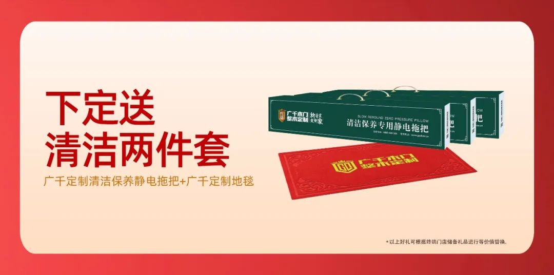 2.活動(dòng)期間,凡在廣千木門(mén)京東商城或?qū)嶓w店交付定金1000元及以上,即可領(lǐng)取價(jià)值98元居家清潔兩件套,線上線下均可使用?。ǘY品可根據(jù)終端門(mén)店儲(chǔ)備禮品進(jìn)行等價(jià)值替換)