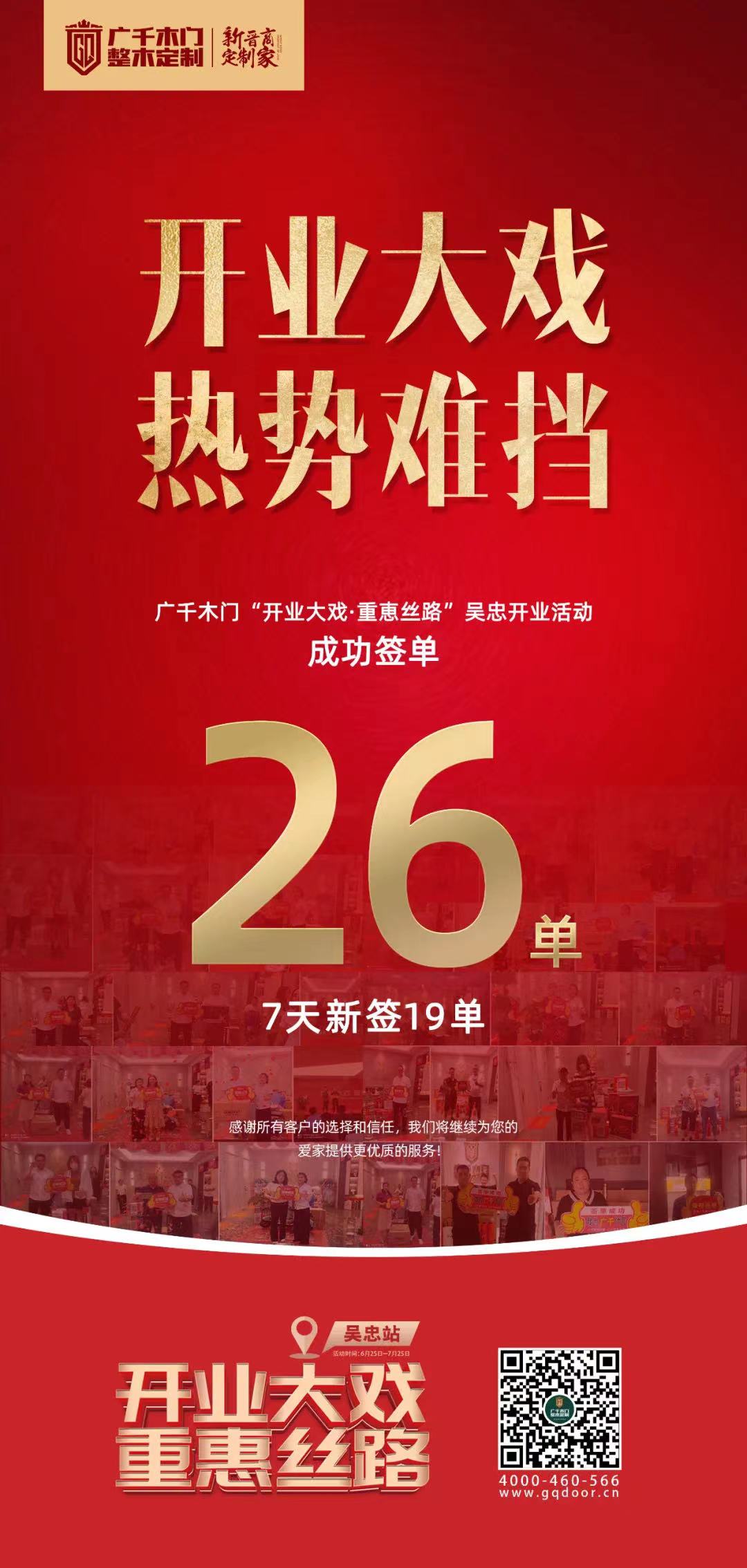 財如曉日騰云起,客似春潮帶雨來。廣千木門·吳忠旗艦店在此次開業(yè)活動中勢如破竹、一鳴驚人,成功簽單26單!如此驕人的戰(zhàn)績不僅為每一位廣千人提供了巨大信心,也為廣千木門整木定制在當?shù)厥袌龃蝽懫放?、打出口碑?/span>