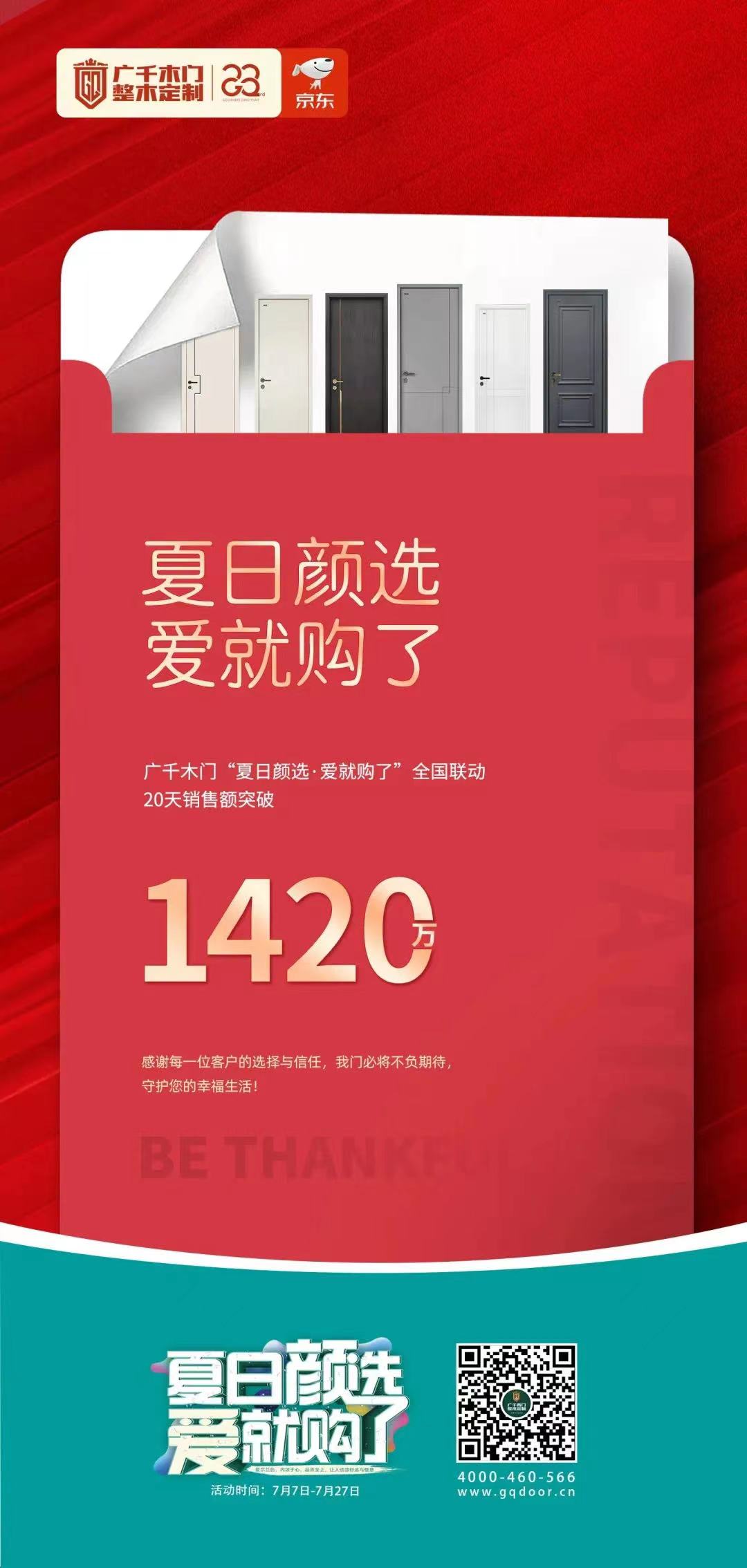 新綠侵人襟袖爽,滿載福利助清涼。炎炎盛夏,中國木門十大品牌廣千木門憑顏值掀起一場夏季清涼奶油風(fēng)家裝煥新盛宴!2022年7月27日,廣千木門“夏日顏選,愛就購了”全國活動(dòng)榮耀收官,20天銷售額突破1420萬,感謝每一位客戶的選擇與信任,廣千將不負(fù)厚愛,持續(xù)守護(hù)您的幸福生活!
