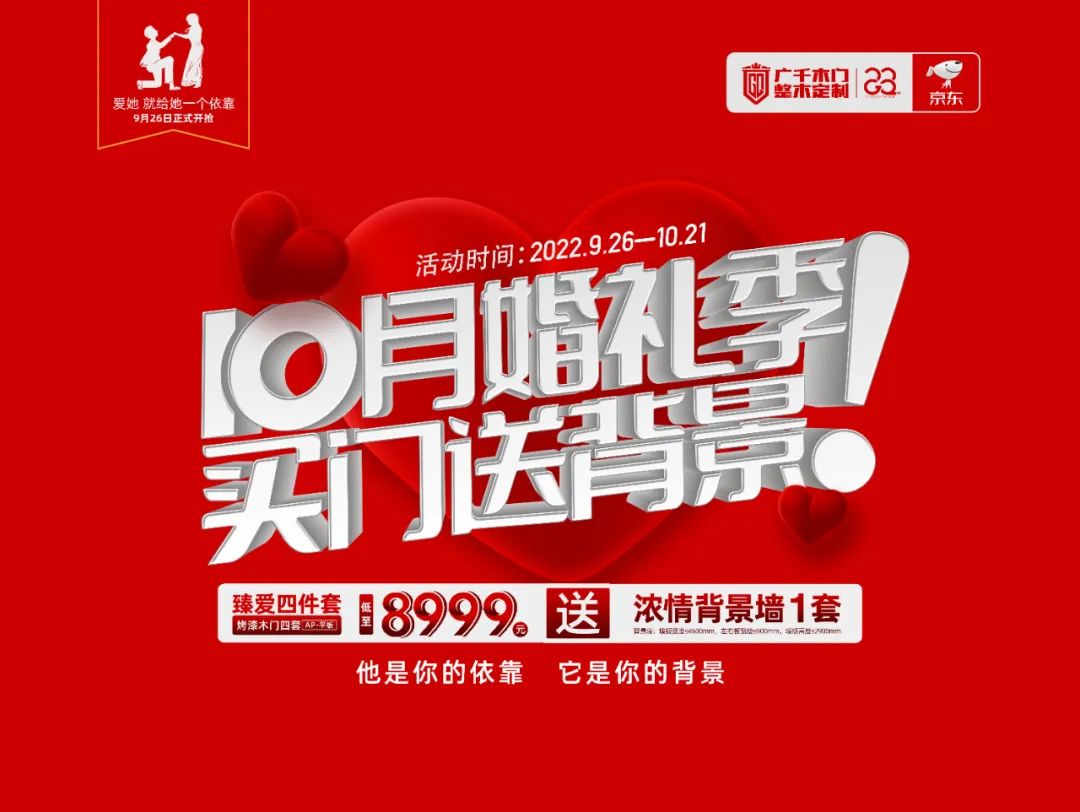 為愛奔赴,為家添彩!2022年9月26日~10月21日,中國木門十大品牌廣千木門總部組織發(fā)起的“10月婚禮季 買門送背景”活動在全國各終端門店盛大開幕!此次活動,廣千木門帶著對即將步入婚姻殿堂的情侶的濃情祝福,傾情奉上重重豪禮!