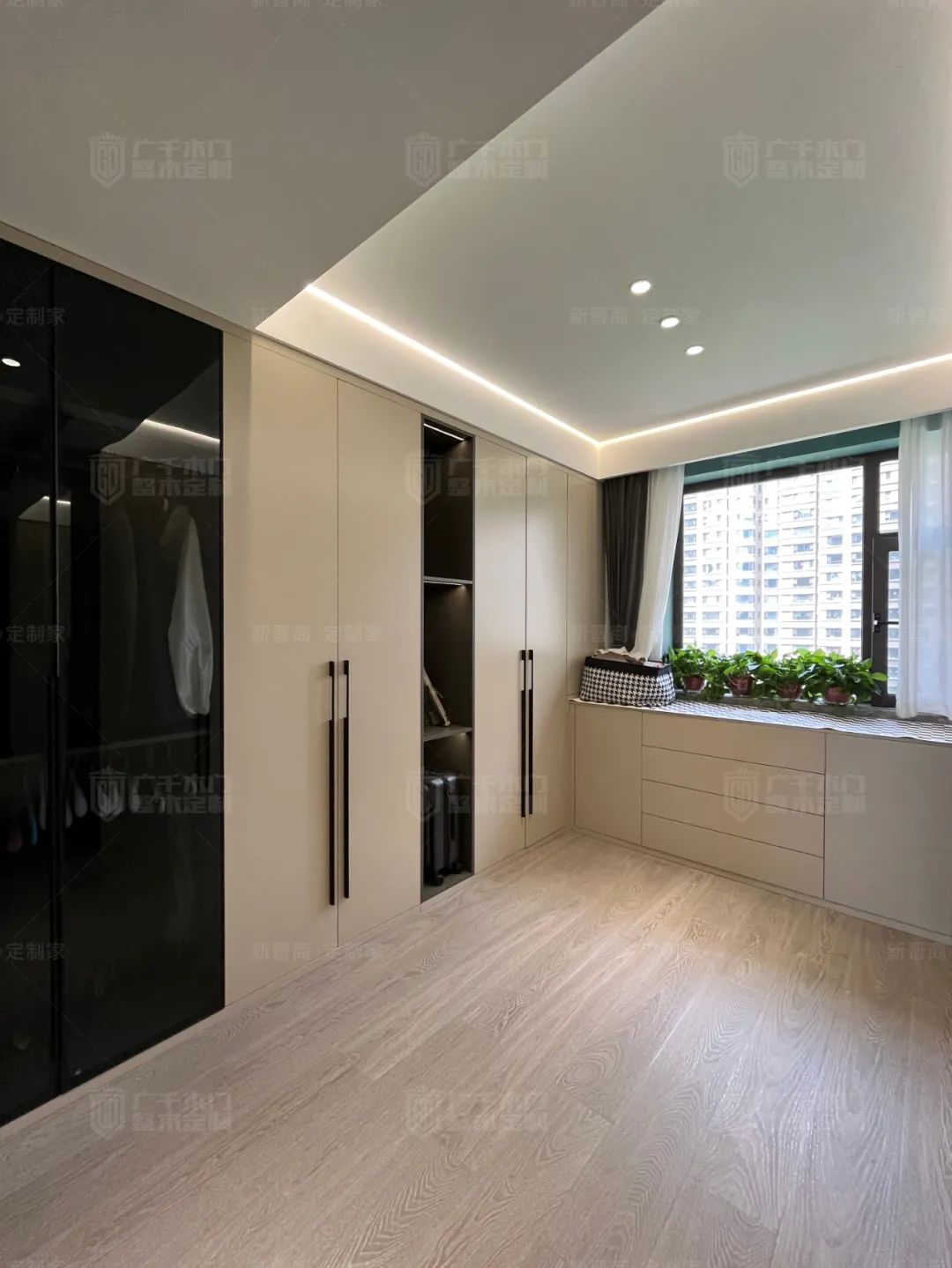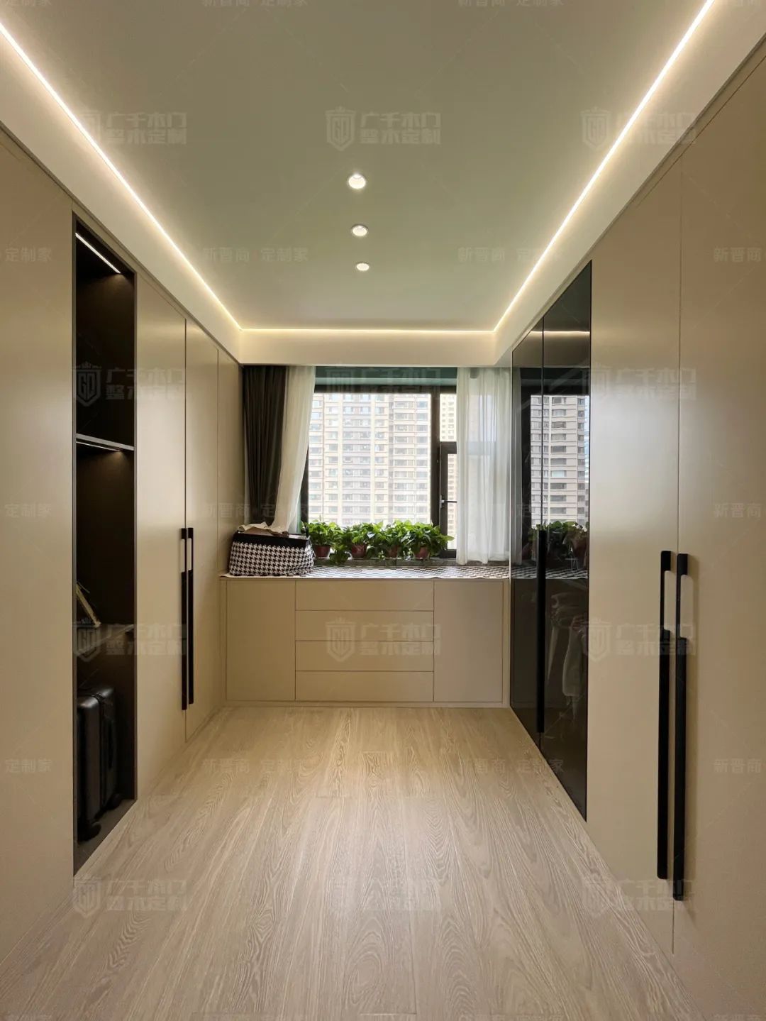 目之所及,美好所至。整個(gè)衣帽間以愛(ài)爾蘭白搭配明斯克灰,于不動(dòng)聲色中裝點(diǎn)出精致與優(yōu)雅。玻璃柜門(mén)與木作柜門(mén)的融合,構(gòu)造出層次分明的換裝空間。開(kāi)放式柜門(mén)的設(shè)計(jì),讓放置于其中的物品一目了然。在淡雅燈光的加持下,摩登質(zhì)感悄然迸發(fā)。