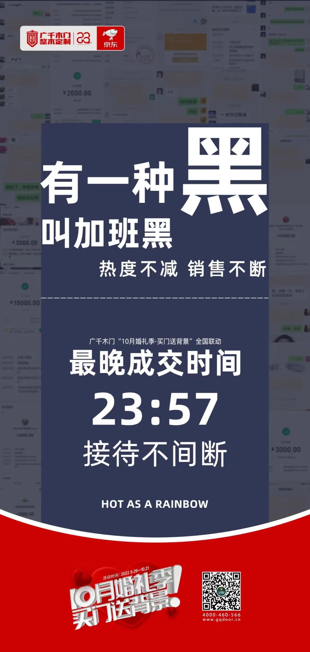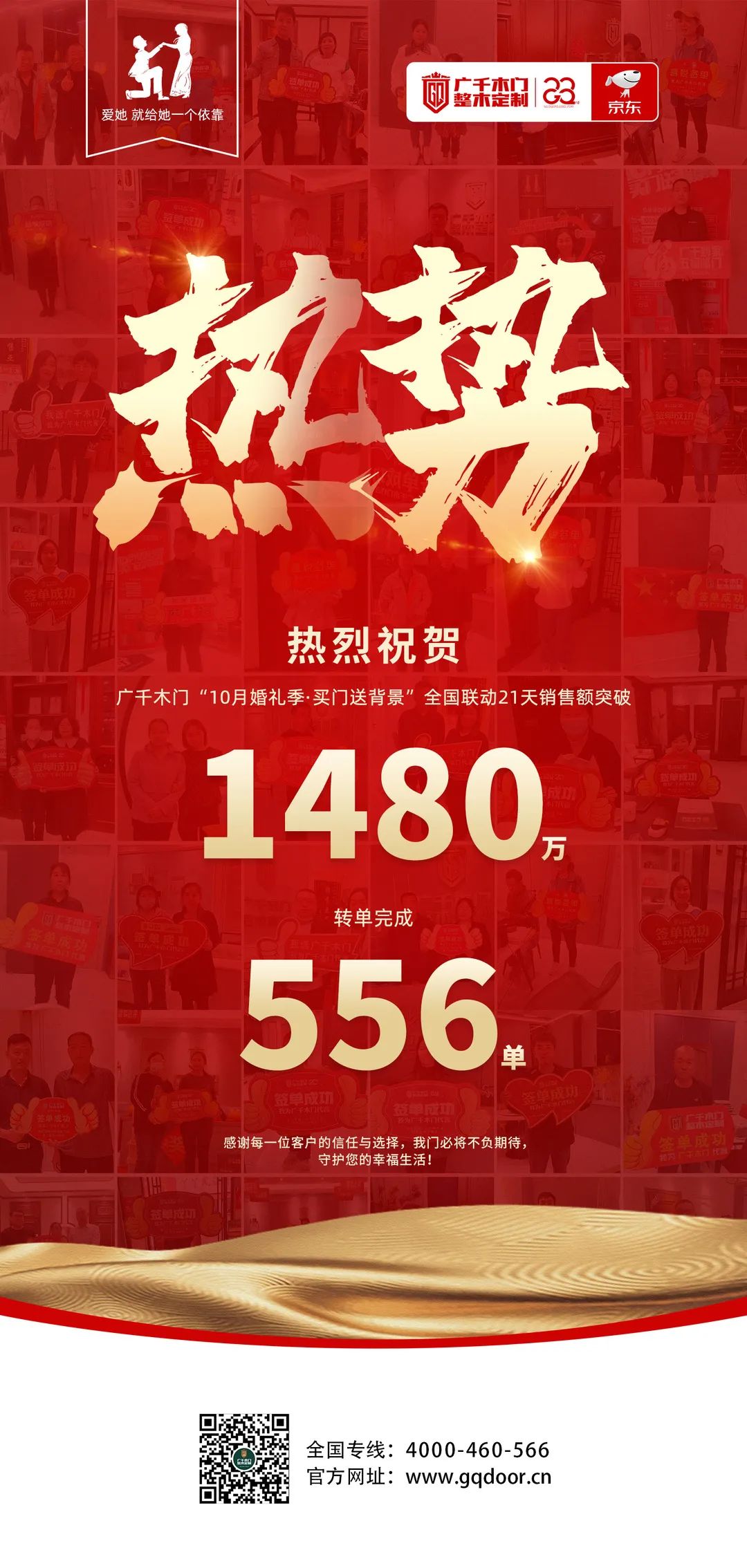 勢(shì)貫長(zhǎng)虹,不負(fù)榮光!2022年10月21日,廣千木門整木定制“10月婚禮季·買門送背景”全國(guó)聯(lián)動(dòng)圓滿告捷,21天銷售額突破1480萬(wàn),轉(zhuǎn)單完成556單!戰(zhàn)績(jī)斐然,可喜可賀!廣千必將不負(fù)期待,持續(xù)守護(hù)您的健康生活!