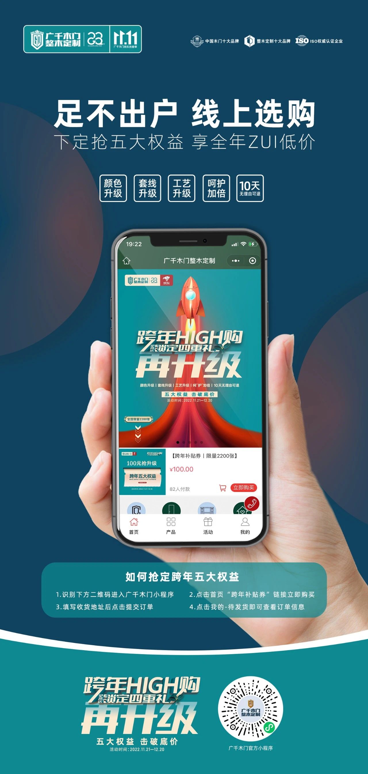 工廠補貼,直通到家!識別二維碼進入整木定制十大品牌“廣千木門”官方小程序下定100元跨年補貼券,即可鎖定五項升級權(quán)益!近期全國各地防疫仍未松懈,此次活動廣千總部特采取線上交定的方式,利用小程序靈活操作的特點來為廣大客戶送福利,大大提高了客戶參與活動的安全系數(shù)和便捷度,讓疫區(qū)的“千粉”也能足不出戶享受優(yōu)惠權(quán)益!