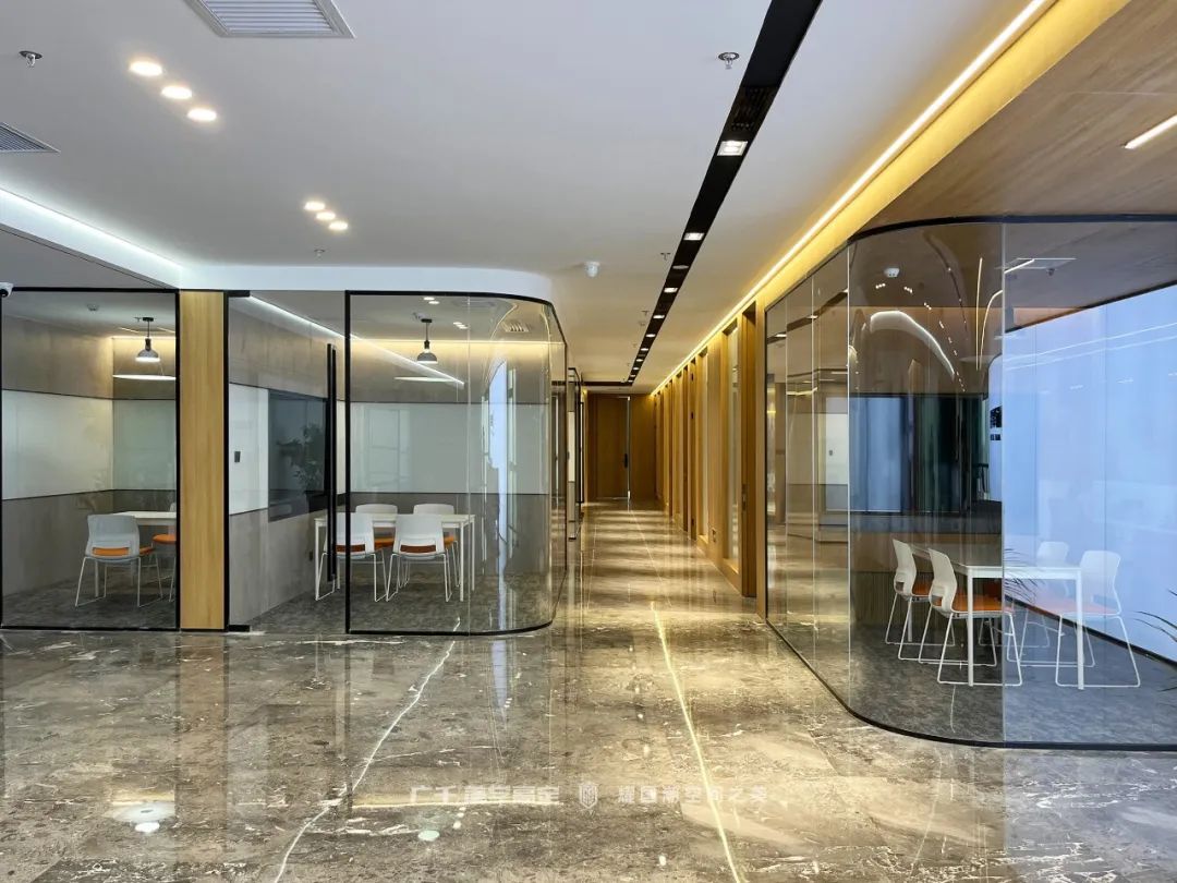 一個(gè)設(shè)計(jì)美觀大氣、時(shí)尚感十足的走廊不僅能提升整個(gè)辦公環(huán)境的檔次,更能提升來(lái)訪客戶對(duì)企業(yè)的好感。走廊的設(shè)計(jì)與整個(gè)空間合二為一,與其他區(qū)域建立了緊密的聯(lián)系。暖光色調(diào)的利用,使空間傳遞出濃濃的親和力,同時(shí)削弱了律所原有設(shè)計(jì)所呈現(xiàn)出的嚴(yán)肅莊重之感,為客戶呈現(xiàn)出簡(jiǎn)潔通透、時(shí)尚大氣的初印象空間。