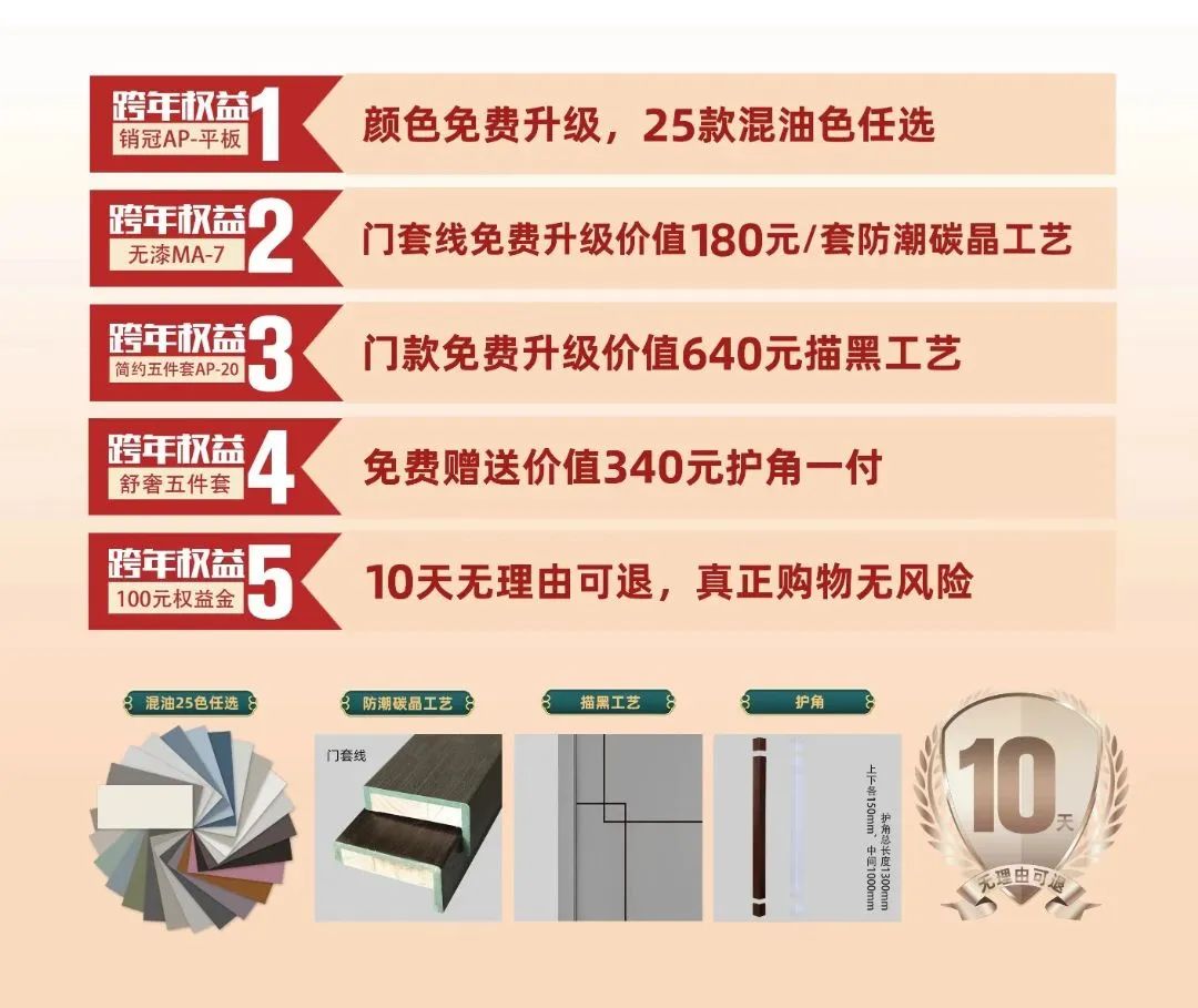 近月以來,由于各地大規(guī)模的封控,部分城市幾近停擺。隨著國家疫情防控政策的調(diào)整,為讓更多消費(fèi)者能享受到跨年福利,中國木門十大品牌廣千木門總部特決定跨年活動(dòng)福利延期!凡在2022年12月31日前下定的新老顧客,均可享受“四重豪禮、五大權(quán)益”,年前確定,開年配齊!接下來,千千帶您復(fù)盤優(yōu)惠,一省到底!