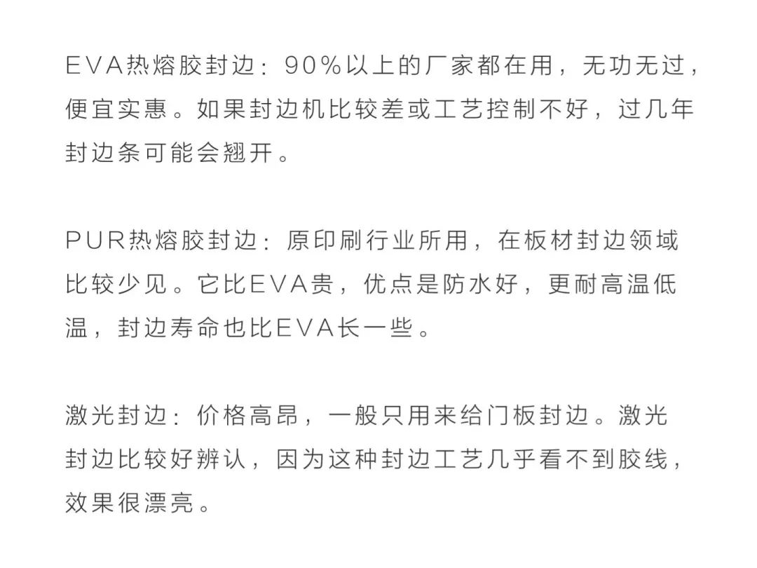 若想判斷板材的環(huán)保性如何的話,分清使用何種膠合劑是一方面,其封邊也是非常重要的。目前市面上常見(jiàn)的封邊工藝有三種,分別是EVA熱熔膠封邊、PUR熱熔膠封邊、激光封邊,可以有效阻止甲醛的釋放。若想弄清楚所購(gòu)置的家具質(zhì)量到底怎么樣,可先用肉眼觀察用來(lái)封邊的膠線是否平整、是否明顯、封邊帶厚度。封邊如果不存在問(wèn)題的話,其環(huán)保性也是值得肯定的。