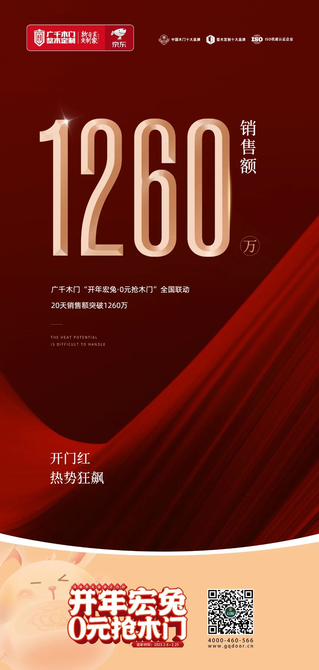 2023年2月25日,中國木門十大品牌廣千木門“開年宏兔 0元搶木門”全國活動圓滿落下帷幕?;顒悠陂g,廣千木門采取線上線下聯(lián)動、全平臺加熱助力等方式,帶領(lǐng)全國終端門店打響了精彩的開年一炮!短短20天內(nèi),銷售額突破1260W,在實現(xiàn)業(yè)績?nèi)€爆破的同時,也為2023奠定了良好開端!